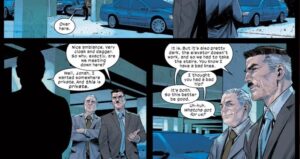 Some other not-so-action-heavy events in this comic involve J. Jonah Jameson and Ben Parker’s activities. They’re running their own news business, The Paper, and they’re getting insider info on their competitor and former company, The Daily Bugle. Who is this mystery informant? It is none other than Joe “Robbie” Robertson, their close friend who is still on the inside. This is a wonderful touch. Robbie was always an important character in the original comics because unlike JJ, who hated Spidey and gave Peter a hard time, Robbie was always understanding.